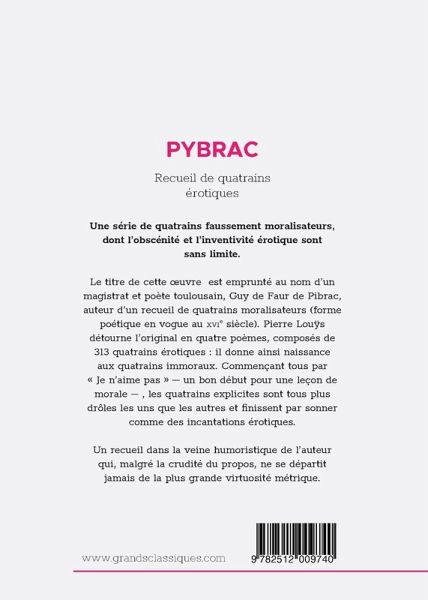 Une série de quatrains faussement moralisateurs, dont l'obscénité et l'inventivité érotique sont sans limite. POUR UN PUBLIC AVERTI. Le titre de cette ¿uvre est emprunté au nom d'un magistrat et poète toulousain, Guy de Faur de Pibrac, auteur d'un recueil de quatrains moralisateurs (forme poétique en vogue au XVIe siècle). Pierre Louÿs détourne l'original en quatre poèmes, composés de 313 quatrains érotiques : il donne ainsi naissance aux quatrains immoraux. Commençant tous par « Je n¿aime pas » ¿ un bon début pour une leçon de morale ¿ , les quatrains explicites sont tous plus drôles les uns que les autres et finissent par sonner comme des incantations érotiques. Un recueil dans la veine humoristique de l'auteur qui, malgré la crudité du propos, ne se départit jamais de la plus grande virtuosité métrique. À PROPOS DE L'AUTEUR Pierre Louÿs (1870-1925), né à Gand et mort à Paris, est un poète et romancier français, également illustre sous les noms de plume Chrysis, Peter Lewys et Pibrac. Il fonde en 1891 la revue littéraire La Conque, où sont publiées les ¿uvres d'auteurs parnassiens et symbolistes, parmi lesquels Mallarmé, Moréas, Verlaine ou encore Leconte de Lisle. Outre Aphrodite, La Femme et le pantin ou encore Les Aventures du Roi Pausole, Pierre Louÿs a rédigé de nombreux romans érotiques, peu à peu révélés à titre posthume. À PROPOS DE LA COLLECTION Retrouvez les plus grands noms de la littérature érotique dans notre collection Grands classiques érotiques. Autrefois poussés à la clandestinité et relégués dans « l'Enfer des bibliothèques », les auteurs de ces ¿uvres incontournables du genre sont aujourd'hui reconnus mondialement. Du Marquis de Sade à Alphonse Momas et ses multiples pseudonymes, en passant par le lyrique Alfred de Musset ou la féministe Renée Dunan, les Grands classiques érotiques proposent un catalogue complet et varié qui contentera tant les novices que les connaisseurs.
