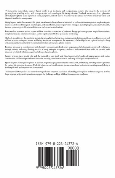 "Pyelonephritis Demystified: Doctor's Secret Guide" is an invaluable and compassionate resource that unravels the mysteries of pyelonephritis, providing readers with a comprehensive understanding of this kidney infection. This book starts with a clear explanation of what pyelonephritis is and explores its causes, symptoms, and risk factors. It underscores the critical importance of early detection and diagnosis for effective management. Going beyond medical treatments, this guide introduces the biopsychosocial approach to pyelonephritis management, emphasizing the interconnectedness of biological, psychological, and social factors. It covers preventive strategies, including hygiene, urinary tract health, immune system support, lifestyle modifications, and preventive medications. In the medical treatment section, readers will find a detailed examination of antibiotic therapy, pain management, surgical interventions, complementary and alternative therapies, and the significance of follow-up care and monitoring. The book also addresses the emotional impact of pyelonephritis, offering stress management techniques, guidance on seeking support, and self-care practices to improve mental well-being. Nutritional strategies and the importance of a healthy diet are explored in-depth, along with exercise and physical activity recommendations tailored to pyelonephritis patients. For those interested in complementary and alternative approaches, the book covers acupuncture, herbal remedies, mind-body techniques, massage therapy, and energy healing practices. Coping strategies, acceptance, resilience, and communication skills are essential tools discussed to help individuals manage the challenges of pyelonephritis. Support systems play a crucial role, and the book delves into family and friend support, the benefits of support groups and online communities, collaborating with healthcare teams, accessing community resources, and using self-help techniques and tools. Special chapters address pyelonephritis in children, pregnancy, aging, mental health, sexual health, and fertility, providing tailored guidance for various life stages and situations. Work-life balance, travel considerations, alternative medicine options, and, most importantly, living a fulfilling life with pyelonephritis are also explored. "Pyelonephritis Demystified" is a comprehensive guide that empowers individuals affected by pyelonephritis and their caregivers. It offers hope, practical advice, and inspiration to navigate the challenges and lead fulfilling lives despite the condition.