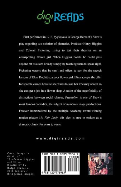 First performed in 1913, "Pygmalion" is George Bernard's Shaw's play regarding two scholars of phonetics, Professor Henry Higgins and Colonel Pickering, trying to test their theories on an unsuspecting flower girl. When Higgins boasts he could pass anyone off as a lord or lady simply by teaching them to speak right, Pickering wagers that he can't and offers to pay for the speech lessons of Eliza Doolittle, a poor flower girl. Eliza accepts the offer for speech lessons because she wants to lose her Cockney accent so she can get a job in a flower shop. A satire of the superficiality of distinctions between social classes, "Pygmalion" is one of Shaw's most famous comedies, the subject of numerous stage productions. Forever immortalized by the multiple Academy award-winning motion picture "My Fair Lady", this play is sure to endure as a dramatic classic for years to come. This edition is printed on premium acid-free paper.