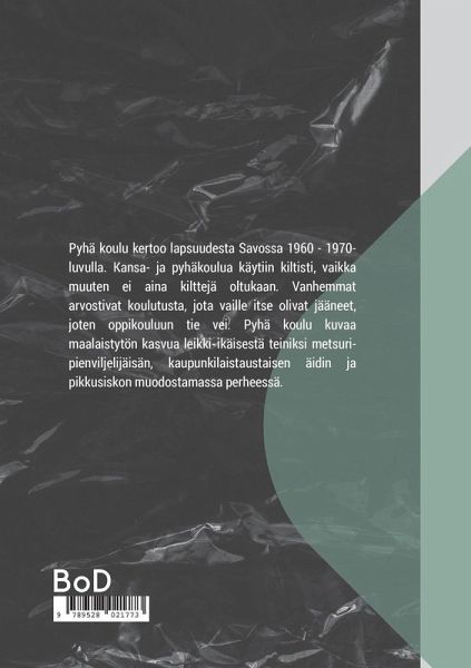 Pyhä koulu kertoo lapsuudesta Savossa 1960 - 1970-luvulla. Kansa- ja pyhäkoulua käytiin kiltisti, vaikka muuten ei aina kilttejä oltukaan. Vanhemmat arvostivat koulutusta, jota vaille itse olivat jääneet, joten oppikouluun tie vei. Pyhä koulu kuvaa maalaistytön kasvua leikki-ikäisestä teiniksi metsuri-pienviljelijäisän, kaupunkilaistaustaisen äidin ja pikkusiskon muodostamassa perheessä.