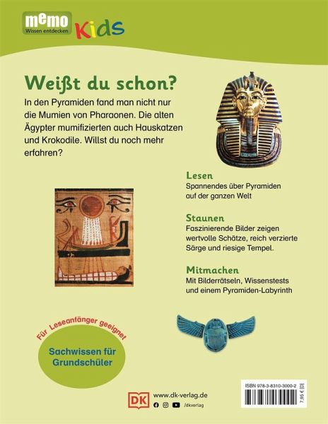 Wer baute die Pyramiden? Warum genau in dieser Form? Diese und unzählige weitere Fragen werden in kurzen, lebendigen Texten leicht verständlich beantwortet und von faszinierenden Abbildungen begleitet. Die altersgerecht aufbereiteten Informationen sind für Leseanfänger einfach verständlich, so dass auch schwierige Zusammenhänge deutlich werden. Viele bunte Fotografien und Illustrationen veranschaulichen das Thema und helfen, das Gelesene zu begreifen. Wissenstests, Bilderrätsel und ein Pyramiden-Labyrinth regen zum Mitmachen an und vertiefen spielerisch das Gelernte. Ein Glossar am Ende des Buches erklärt schwierige Wörter und »Weißt du das?«-Kästen heben besonders interessante Fakten hervor. Durch die optimale Ausgewogenheit von Bild und Text ist »memo Kids - Pyramiden« ideal zum Vor- oder Selberlesen geeignet. Wissen zum Sammeln: Alle memo Kids Bände sind nummeriert und sind mit einem durchgängigen Rückendesign gestaltet - so wächst mit jedem neuen Band im Bücherregal ein cooles Motiv mit!