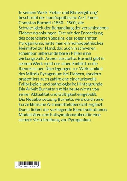 In seinem Werk 'Fieber und Blutvergiftung' beschreibt der homöopathische Arzt James Compton Burnett (1850 - 1901) die Schwierigkeit der Behandlung der verschiedenen Fiebererkrankungen. Erst mit der Entdeckung des potenzierten Sepsins, des sogenannten Pyrogeniums, hatte man ein homöopathisches Heilmittel zur Hand, das auch in schweren, scheinbar unbehandelbaren Fällen eine wirkungsvolle Arznei darstellte. Burnett gibt in seinem Werk nicht nur einen Einblick in die theoretischen Überlegungen zur Wirksamkeit des Mittels Pyrogenium bei Fiebern, sondern präsentiert auch zahlreiche eindrucksvolle Fallbeispiele und pathologische Hintergründe.Die Arbeit Burnetts hat bis heute nichts von seiner Aktualität und Gültigkeit eingebüßt.Die Neuübersetzung Burnetts wird durch eine kurze klinische Arzneimittelübersicht ergänzt. Damit liefert der vorliegende Band Indikationen, Modalitäten und Fallsymptomatiken für eine sichere Verschreibung von Pyrogenium.