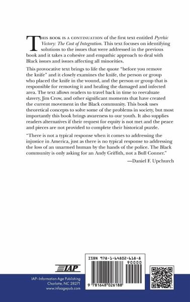 This book is a continuation of the first text entitled "Pyrrhic Victory The Cost of Integration". This text focuses on identifying solutions to the issues that were addressed in the previous book and it takes a cohesive and empathic approach to deal with Black issues and issues affecting all minorities. This provocative text brings to life the quote "Before You Remove The Knife" and it closely examines the knife, the person or group who placed the knife in the wound, and the person or group that is responsible for removing it and healing the damaged and infected area. The text allows readers to travel back in time to reevaluate slavery, Jim Crow, and other significant moments that have created the current movement in the Black community. This book uses theoretical concepts to solve some of the problems in society, but most importantly this book brings awareness to our youth. It also supplies readers alternatives if their request for equity is not met and the peace and pieces are not provided to complete their historical puzzle. "There is not a typical response when it comes to addressing the injustice in America, just as there is no typical response to addressing the loss of an unarmed human by the hands of the police. The Black community is only asking for an Andy Griffith, not a Bull Conner." -Daniel F. Upchurch.