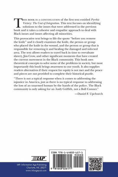 This book is a continuation of the first text entitled "Pyrrhic Victory The Cost of Integration". This text focuses on identifying solutions to the issues that were addressed in the previous book and it takes a cohesive and empathic approach to deal with Black issues and issues affecting all minorities. This provocative text brings to life the quote "Before You Remove The Knife" and it closely examines the knife, the person or group who placed the knife in the wound, and the person or group that is responsible for removing it and healing the damaged and infected area. The text allows readers to travel back in time to reevaluate slavery, Jim Crow, and other significant moments that have created the current movement in the Black community. This book uses theoretical concepts to solve some of the problems in society, but most importantly this book brings awareness to our youth. It also supplies readers alternatives if their request for equity is not met and the peace and pieces are not provided to complete their historical puzzle. "There is not a typical response when it comes to addressing the injustice in America, just as there is no typical response to addressing the loss of an unarmed human by the hands of the police. The Black community is only asking for an Andy Griffith, not a Bull Conner." -Daniel F. Upchurch.