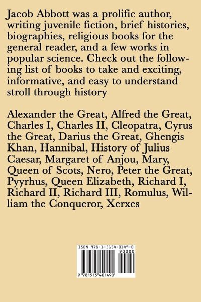 Jacob Abbott was a prolific author, writing juvenile fiction, brief histories, biographies, religious books for the general reader, and a few works in popular science. Check out the following list of books to take and exciting, informative, and easy to understand stroll through history Alexander the Great, Alfred the Great, Charles I, Charles II, Cleopatra, Cyrus the Great, Darius the Great, Ghengis Khan, Hannibal, History of Julius Caesar, Margaret of Anjou, Mary, Queen of Scots, Nero, Peter the Great, Pyyrhus, Queen Elizabeth, Richard I, Richard II, Richard III, Romulus, William the Conqueror, Xerxes