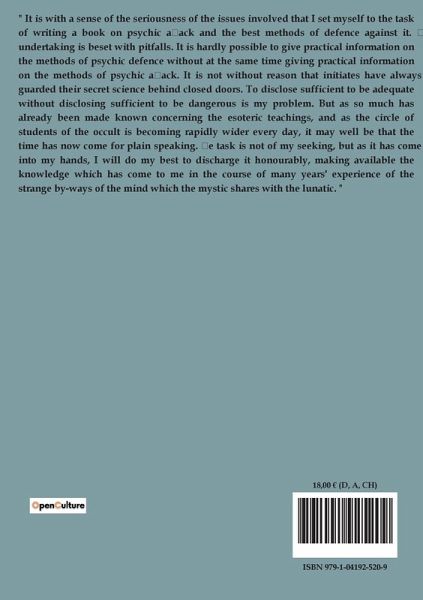 " It is with a sense of the seriousness of the issues involved that I set myself to the task of writing a book on psychic äack and the best methods of defence against it. ¿e undertaking is beset with pitfalls. It is hardly possible to give practical information on the methods of psychic defence without at the same time giving practical information on the methods of psychic äack. It is not without reason that initiates have always guarded their secret science behind closed doors. To disclose sufficient to be adequate without disclosing sufficient to be dangerous is my problem. But as so much has already been made known concerning the esoteric teachings, and as the circle of students of the occult is becoming rapidly wider every day, it may well be that the time has now come for plain speaking. ¿e task is not of my seeking, but as it has come into my hands, I will do my best to discharge it honourably, making available the knowledge which has come to me in the course of many years' experience of the strange by-ways of the mind which the mystic shares with the lunatic. "