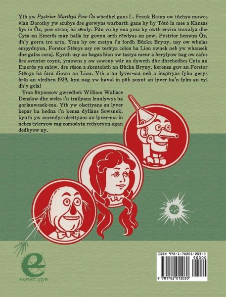 Yth yw Pystrior Marthys Pow Òz whedhel gans L. Frank Baum ow tùchya mowes vian Dorothy yw scubys dre gorwyns warbarth gans hy hy Tôtô in mes a Kansas bys in Òz, pow stranj ha sêmly. Pàn vo hy ena yma hy owth ervira travalya dhe Cyta an Emerôs may halla hy govyn orth rêwlyas an pow, Pystrior henwys Òz, dh’y gorra tre arta. Yma hy ow metya i’n fordh Bùcka Bryny, usy ow whelas empydnyon, Forstor Stênys usy ow tesîrya colon ha Lion ownek neb yw whansek dhe gafos coraj. Kynth usy an bagas bian ow tastya meur a berylyow hag ow cafos lies aventur coynt, ymowns y ow soweny wàr an dyweth dhe dhrehedhes Cyta an Emerôs yn salow, dre rêson a skentoleth an Bùcka Bryny, kerensa guv an Forstor Stênys ha fara diown an Lion. Yth o an lyver-ma neb a inspîryas fylm gerys brâs an vledhen 1939, kyn nag yw haval in pùb poynt an lyver ha’n fylm an eyl dh’y gela! Yma lînyansow gwredhek William Wallace Denslow dhe weles i’n trailyans leunlywys ha gorlanwesek-ma. Yma 24 plâta lywys i’n lyver ha 150 delînyansow text; hag y feu radn a’n re-na desedhys dhe acordya poran gans an trailyans Kernowek. Yth yw olsettyans an lyver kepar ha hedna i’n kensa dyllans Sowsnek, kynth yw amendys olsettyans an lyver-ma in nebes tyleryow rag comodyta redyoryon agan dedhyow ny. --- The Wonderful Wizard of Oz is L. Frank Baum's story of a little girl named Dorothy, who with her dog Toto is carried by a tornado from Kansas to the strange and beautiful land of Oz. Here she decides to visit the Emerald City to ask its ruler, a wizard called Oz, to send her back home again. On the way she meets a Scarecrow, who is in search of brains; a Tin Woodman, who wishes to have a heart; and a Cowardly Lion, whose one desire is to possess courage. The little party encounter many dangers and marvelous adventures on the way, but reach the Emerald City in safety, their success being due to the thoughtfulness of the Scarecrow, the tender care of the Tin Woodman, and the fearlessness of the Cowardly Lion. This is the book that inspired the famous 1939 film -- which differs from the original book in quite a few ways! This full-colour book contains the original illustrations by William Wallace Denslow which were were scanned from copies of the first edition. There are 24 colour plates and 150 text illustrations, many localized into the Cornish language. The book has been typeset a fashion similar to that of the first edition, with some typographic improvements for the modern reader.