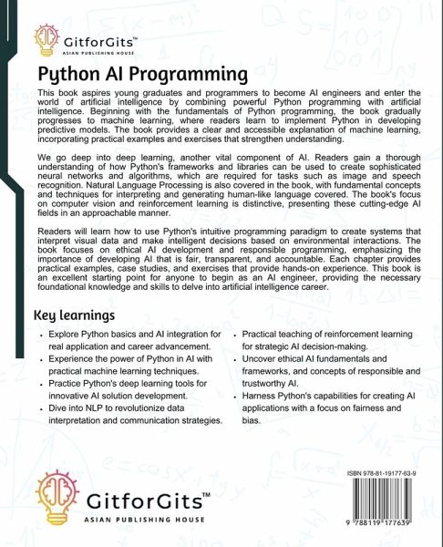 This book aspires young graduates and programmers to become AI engineers and enter the world of artificial intelligence by combining powerful Python programming with artificial intelligence. Beginning with the fundamentals of Python programming, the book gradually progresses to machine learning, where readers learn to implement Python in developing predictive models. The book provides a clear and accessible explanation of machine learning, incorporating practical examples and exercises that strengthen understanding. We go deep into deep learning, another vital component of AI. Readers gain a thorough understanding of how Python's frameworks and libraries can be used to create sophisticated neural networks and algorithms, which are required for tasks such as image and speech recognition. Natural Language Processing is also covered in the book, with fundamental concepts and techniques for interpreting and generating human-like language covered. The book's focus on computer vision and reinforcement learning is distinctive, presenting these cutting-edge AI fields in an approachable manner. Readers will learn how to use Python's intuitive programming paradigm to create systems that interpret visual data and make intelligent decisions based on environmental interactions. The book focuses on ethical AI development and responsible programming, emphasizing the importance of developing AI that is fair, transparent, and accountable. Each chapter is designed to improve learning by including practical examples, case studies, and exercises that provide hands-on experience. This book is an excellent starting point for anyone interested in becoming an AI engineer, providing the necessary foundational knowledge and skills to delve into the fascinating world of artificial intelligence. Key LearningsExplore Python basics and AI integration for real-world application and career advancement. Experience the power of Python in AI with practical machine learning techniques. Practice Python's deep learning tools for innovative AI solution development. Dive into NLP with Python to revolutionize data interpretation and communication strategies. Simple yet practical understanding of reinforcement learning for strategic AI decision making. Uncover ethical AI development and frameworks, and concepts of responsible and trustworthy AI. Harness Python's capabilities for creating AI applications with a focus on fairness and bias. Table of ContentIntroduction to Artificial Intelligence Python for AI Data as Fuel for AI Machine Learning Foundation Essentials of Deep Learning NLP and Computer Vision Hands-on Reinforcement Learning Ethics to AI