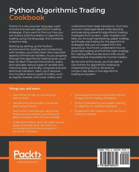 Build a solid foundation in algorithmic trading by developing, testing and executing powerful trading strategies with real market data using Python Key Features Build a strong foundation in algorithmic trading by becoming well-versed with the basics of financial markets Demystify jargon related to understanding and placing multiple types of trading orders Devise trading strategies and increase your odds of making a profit in stock markets without human intervention Book Description Python is a very popular language used to build and execute algorithmic trading strategies. If you want to find out how you can build a solid foundation in algorithmic trading using the language, this cookbook is here to help. Starting by setting up the Python environment for trading and connectivity with brokers, you’ll then learn the important aspects of financial markets. As you progress through this algorithmic trading book, you’ll learn to fetch financial instruments, query and calculate various types of candles and historical data, and finally, compute and plot technical indicators. Next, you’ll discover how to place various types of orders, such as regular, bracket, and cover orders, and understand their state transitions. You’ll also uncover challenges faced while devising and executing powerful algorithmic trading strategies from scratch. Later chapters will take you through backtesting, paper trading, and finally real trading for the algorithmic strategies that you've created from the ground up. You’ll even understand how to automate trading and find the right strategy for making effective decisions that would otherwise be impossible for human traders. By the end of this book, you’ll be able to use Python for algorithmic trading by implementing Python libraries to conduct key tasks in the algorithmic trading ecosystem. What you will learn Use Python to set up connectivity with brokers Handle and manipulate time series data using Python Fetch a list of exchanges, segments, financial instruments, and historical data to interact with the real market Understand, fetch, and calculate various types of candles and use them to compute and plot diverse types of technical indicators Develop and improve the performance of algorithmic trading strategies Perform backtesting and paper trading on algorithmic trading strategies Implement real trading in the live hours of stock markets Who this book is for If you are a financial analyst, financial trader, data analyst, algorithmic trader, trading enthusiast or anyone who wants to learn algorithmic trading with Python and important techniques to address challenges faced in the finance domain, this book is for you. Basic working knowledge of the Python programming language is expected. Although fundamental knowledge of trade-related terminologies will be helpful, it is not mandatory.