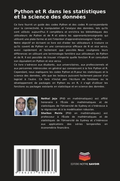 Ce livre fournit un guide des codes Python et des codes R correspondants pour la connectivité, la manipulation et l'analyse des données, tels qu'ils sont utilisés aujourd'hui. Il complétera et enrichira les bibliothèques des utilisateurs de Python et de R et aidera les apprenants/enseignants qui utilisent une plate-forme et ont l'intention d'apprendre/enseigner l'autre.Notre objectif en écrivant ce livre est d'aider les utilisateurs à traduire ce qu'ils savent de Python en une connaissance efficace de R et vice versa, aussi rapidement et facilement que possible. Nous soulignons leurs différences en utilisant une terminologie familière aux utilisateurs de Python et de R. Il est possible de trouver n'importe quelle fonction R en consultant son équivalent en Python et vice versa.Ce livre s'adresse aux étudiants, aux universitaires, aux professionnels et aux personnes intéressées en général qui connaissent à la fois Python et R. Cependant, nous expliquons les codes Python et R pour les statistiques et la science des données, afin que les lecteurs puissent facilement passer d'un logiciel à l'autre. Ce livre n'inclut pas l'écriture de fonctions ou le développement de packages en Python ou en R, il s'agit d'utiliser les fonctions ou packages existants en statistique et en science des données.