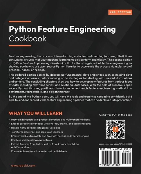 Create end-to-end, reproducible feature engineering pipelines that can be deployed into production using open-source Python libraries Key Features:Learn and implement feature engineering best practices Reinforce your learning with the help of multiple hands-on recipes Build end-to-end feature engineering pipelines that are performant and reproducible Book Description: Feature engineering, the process of transforming variables and creating features, albeit time-consuming, ensures that your machine learning models perform seamlessly. This second edition of Python Feature Engineering Cookbook will take the struggle out of feature engineering by showing you how to use open source Python libraries to accelerate the process via a plethora of practical, hands-on recipes. This updated edition begins by addressing fundamental data challenges such as missing data and categorical values, before moving on to strategies for dealing with skewed distributions and outliers. The concluding chapters show you how to develop new features from various types of data, including text, time series, and relational databases. With the help of numerous open source Python libraries, you'll learn how to implement each feature engineering method in a performant, reproducible, and elegant manner. By the end of this Python book, you will have the tools and expertise needed to confidently build end-to-end and reproducible feature engineering pipelines that can be deployed into production. What You Will Learn:Impute missing data using various univariate and multivariate methods Encode categorical variables with one-hot, ordinal, and count encoding Handle highly cardinal categorical variables Transform, discretize, and scale your variables Create variables from date and time with pandas and Feature-engine Combine variables into new features Extract features from text as well as from transactional data with Featuretools Create features from time series data with tsfresh Who this book is for: This book is for machine learning and data science students and professionals, as well as software engineers working on machine learning model deployment, who want to learn more about how to transform their data and create new features to train machine learning models in a better way.