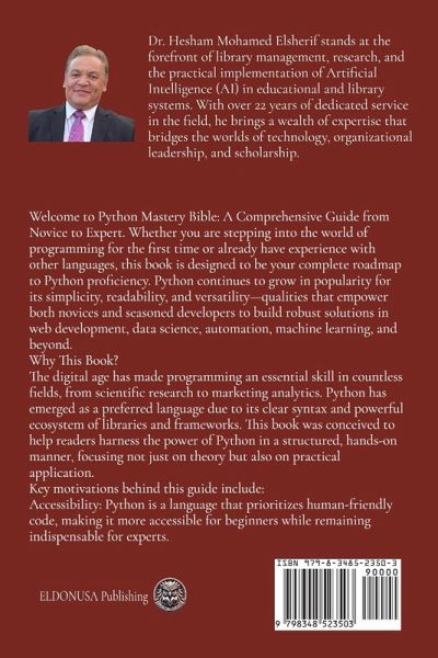 Welcome to Python Mastery Bible: A Comprehensive Guide from Novice to Expert. Whether you are stepping into the world of programming for the first time or already have experience with other languages, this book is designed to be your complete roadmap to Python proficiency. Python continues to grow in popularity for its simplicity, readability, and versatility-qualities that empower both novices and seasoned developers to build robust solutions in web development, data science, automation, machine learning, and beyond. Why This Book? The digital age has made programming an essential skill in countless fields, from scientific research to marketing analytics. Python has emerged as a preferred language due to its clear syntax and powerful ecosystem of libraries and frameworks. This book was conceived to help readers harness the power of Python in a structured, hands-on manner, focusing not just on theory but also on practical application. Key motivations behind this guide include: Accessibility: Python is a language that prioritizes human-friendly code, making it more accessible for beginners while remaining indispensable for experts. Comprehensive Depth: While beginner tutorials exist in abundance, many of them skip advanced or specialized areas. This guide aims to provide a complete learning path-from fundamental building blocks to sophisticated features and real-world applications. Practice-Focused Learning: True mastery comes from doing, not just reading. You will find a variety of example-driven lessons, exercises, and project ideas that reinforce each chapter's concepts. Who Should Read This Book? 1. Absolute Beginners: Individuals new to programming who want a clear, methodical introduction to Python. 2. Intermediate Programmers: Those who have dabbled in Python or other languages and want to deepen their understanding of core and advanced concepts. 3. Professional Developers: Software engineers, web developers, and data scientists who aim to refine their Python skills or expand into new Python-based domains (such as asynchronous programming, data analysis, or web development). 4. Students and Researchers: Academics looking to utilize Python for prototyping, data processing, and building research tools. Regardless of your background, this book provides a structured path to becoming confident and efficient in Python programming.