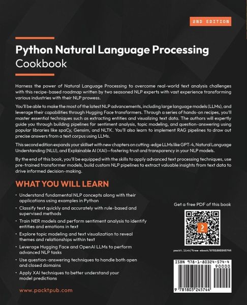 Updated to include three new chapters on transformers, natural language understanding (NLU) with explainable AI, and dabbling with popular LLMs from Hugging Face and OpenAI Key Features: - Leverage ready-to-use recipes with the latest LLMs, including Mistral, Llama, and OpenAI models - Use LLM-powered agents for custom tasks and real-world interactions - Gain practical, in-depth knowledge of transformers and their role in implementing various NLP tasks with open-source and advanced LLMs - Purchase of the print or Kindle book includes a free PDF eBook Book Description: Harness the power of Natural Language Processing to overcome real-world text analysis challenges with this recipe-based roadmap written by two seasoned NLP experts with vast experience transforming various industries with their NLP prowess. You'll be able to make the most of the latest NLP advancements, including large language models (LLMs), and leverage their capabilities through Hugging Face transformers. Through a series of hands-on recipes, you'll master essential techniques such as extracting entities and visualizing text data. The authors will expertly guide you through building pipelines for sentiment analysis, topic modeling, and question-answering using popular libraries like spaCy, Gensim, and NLTK. You'll also learn to implement RAG pipelines to draw out precise answers from a text corpus using LLMs. This second edition expands your skillset with new chapters on cutting-edge LLMs like GPT-4, Natural Language Understanding (NLU), and Explainable AI (XAI)-fostering trust and transparency in your NLP models. By the end of this book, you'll be equipped with the skills to apply advanced text processing techniques, use pre-trained transformer models, build custom NLP pipelines to extract valuable insights from text data to drive informed decision-making. What You Will Learn: - Understand fundamental NLP concepts along with their applications using examples in Python - Classify text quickly and accurately with rule-based and supervised methods - Train NER models and perform sentiment analysis to identify entities and emotions in text - Explore topic modeling and text visualization to reveal themes and relationships within text - Leverage Hugging Face and OpenAI LLMs to perform advanced NLP tasks - Use question-answering techniques to handle both open and closed domains - Apply XAI techniques to better understand your model predictions Who this book is for: This updated edition of the Python Natural Language Processing Cookbook is for data scientists, machine learning engineers, and developers with a background in Python. Whether you're looking to learn NLP techniques, extract valuable insights from textual data, or create foundational applications, this book will equip you with basic to intermediate skills. No prior NLP knowledge is necessary to get started. All you need is familiarity with basic programming principles. For seasoned developers, the updated sections offer the latest on transformers, explainable AI, and Generative AI with LLMs. Table of Contents - Learning NLP Basics - Playing with Grammar - Representing Text - Capturing Semantics - Classifying Texts - Getting Started with Information Extraction - Topic Modeling - Visualizing Text Data - Transformers and Their Applications - Natural Language Understanding - Generative AI and Large Language Models