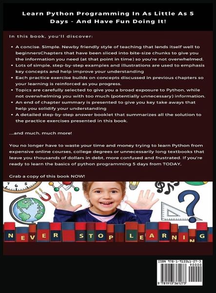 If You Want To Learn Python Programming In As Little As 5 Days - And Have Fun Doing It, Read On... How many times have you thought about learning how to code but got discouraged because you had no technical background, didn't have the time to learn, or you just didn't think you were smart enough to have a crack at it? Well, we have good news for you. You Don't Need An Expensive Computer Science Degree, A 500 Page Textbook or A Genius Mind To Learn The Basics Of Python Programming! 5 times #1 Amazon bestselling author, James Tudor, provides a concise, step-by-step guide to Python programming for beginners. A lot of examples, illustrations, end of chapter summary and practice exercises (with solutions) are provided to help the reader learn faster, remember longer and develop a thorough understanding of key concepts. In This Book, you'll discover:A concise. Simple. Newby friendly style of teaching that lends itself well to beginners Chapters that have been sliced into bite-size chunks to give you the information you need (at that point in time) so you're not overwhelmed. Lots of simple, step-by-step examples and illustrations are used to emphasis key concepts and help improve your understanding Each practice exercise builds on concepts discussed in previous chapters so your learning is reinforced as you progress. Topics are carefully selected to give you a broad exposure to Python, while not overwhelming you with too much (potentially unnecessary) information. An end of chapter summary is presented to give you key takeaways that help you solidify your understanding A detailed step-by-step answer section that summarizes all the solution to the practice exercises presented in this book. ¿¿NOTE¿¿: Because this book is enrolled in Kindle Matchbook, Amazon will make the kindle edition of this book available to you for FREE when you purchase the paperback version today (Offer is only available to Amazon USA Customers) You no longer have to waste your time and money trying to learn Python from expensive online courses, college degrees or unnecessarily long textbooks that leave you thousands of dollars in debt, more confused and frustrated. If you're ready to learn the basics of python programming 5 days from TODAY, grab a copy of this book today! Scroll to the top of the page and click the "BUY NOW" button!