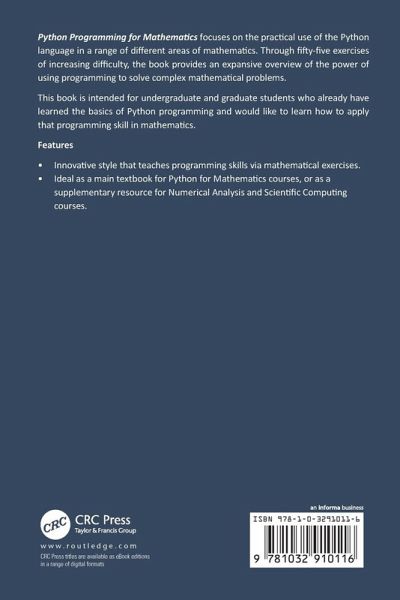 This book focuses on the practical use of the Python language in a range of different areas of mathematics. Through fifty-five exercises of increasing difficulty, the book provides an expansive overview of the power of using programming to solve complex mathematical problems.