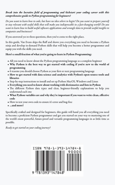 Break into the lucrative field of programming and kickstart your coding career with this comprehensive guide to Python programming for beginners! Do you want to learn how to code, but have no idea where to begin? Do you want to prepare yourself to stay relevant with useful skills that will make you indispensable in a fast-changing world? Do you want to learn how to build useful software applications and wrangle data to provide useful insights to companies and businesses? If you answered yes to these questions, then you've come to the right place. In this guide, Van Evans skips the fluff and shows you everything you need to become a Python ninja and develop in-demand Python skills that will help you become a better programmer and equip you with the skills you need. Here's a small fraction of what you're going to learn in Python Programming:All you need to know about the Python programming language as a complete beginner Why Python is the best way to get started with coding if you're new to the world of programming 6 reasons you should choose Python as your first or next programming language How to get started with data science and analytics with Python's open-source tools and libraries Step-by-step instructions to install and set up Python MacOS, Windows and Linux Everything you need to know about working with dictionaries and lists in Python The different Python data types and clear, beginner-friendly explanations to help you understand each one What Python variables are and why they're important if you want to write clean, effective code How to test your own code to ensure it's error and bug-free ...and more! Specifically crafted and designed for beginners, this guide will hand you all everything you need to become a proficient Python programmer and get you started on your way to mastering one of the world's most powerful, future-proof and versatile programming languages in as little time as possible. Ready to get started on your coding journey?