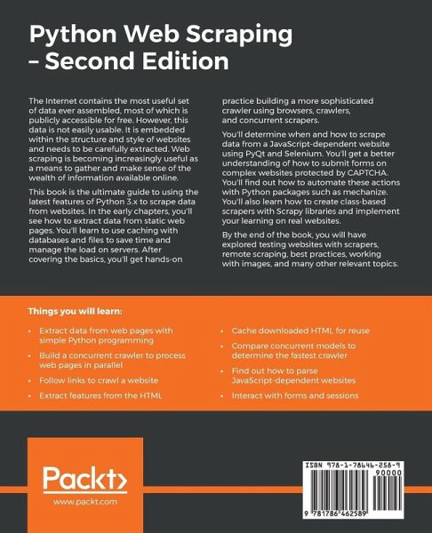 Successfully scrape data from any website with the power of Python 3.x Key Features:A hands-on guide to web scraping using Python with solutions to real-world problems Create a number of different web scrapers in Python to extract information This book includes practical examples on using the popular and well-maintained libraries in Python for your web scraping needs Book Description: The Internet contains the most useful set of data ever assembled, most of which is publicly accessible for free. However, this data is not easily usable. It is embedded within the structure and style of websites and needs to be carefully extracted. Web scraping is becoming increasingly useful as a means to gather and make sense of the wealth of information available online. This book is the ultimate guide to using the latest features of Python 3.x to scrape data from websites. In the early chapters, you'll see how to extract data from static web pages. You'll learn to use caching with databases and files to save time and manage the load on servers. After covering the basics, you'll get hands-on practice building a more sophisticated crawler using browsers, crawlers, and concurrent scrapers. You'll determine when and how to scrape data from a JavaScript-dependent website using PyQt and Selenium. You'll get a better understanding of how to submit forms on complex websites protected by CAPTCHA. You'll find out how to automate these actions with Python packages such as mechanize. You'll also learn how to create class-based scrapers with Scrapy libraries and implement your learning on real websites. By the end of the book, you will have explored testing websites with scrapers, remote scraping, best practices, working with images, and many other relevant topics. What You Will Learn:Extract data from web pages with simple Python programming Build a concurrent crawler to process web pages in parallel Follow links to crawl a website Extract features from the HTML Cache downloaded HTML for reuse Compare concurrent models to determine the fastest crawler Find out how to parse JavaScript-dependent websites Interact with forms and sessions Who this book is for: This book is aimed at developers who want to use web scraping for legitimate purposes. Prior programming experience with Python would be useful but not essential. Anyone with general knowledge of programming languages should be able to pick up the book and understand the principals involved.