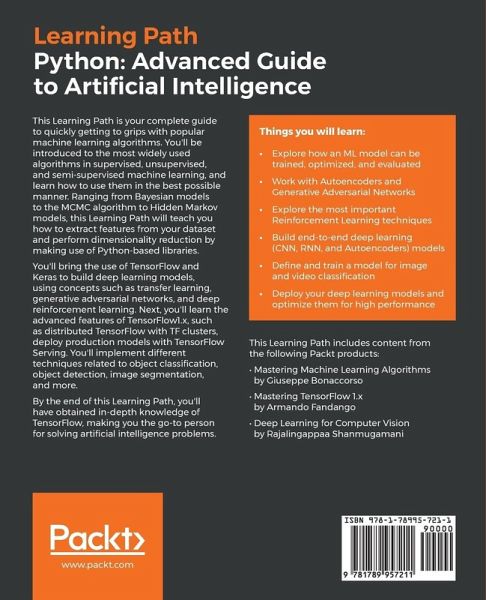 Demystify the complexity of machine learning techniques and create evolving, clever solutions to solve your problems Key Features:Master supervised, unsupervised, and semi-supervised ML algorithms and their implementation Build deep learning models for object detection, image classification, similarity learning, and more Build, deploy, and scale end-to-end deep neural network models in a production environment Book Description: This Learning Path is your complete guide to quickly getting to grips with popular machine learning algorithms. You'll be introduced to the most widely used algorithms in supervised, unsupervised, and semi-supervised machine learning, and learn how to use them in the best possible manner. Ranging from Bayesian models to the MCMC algorithm to Hidden Markov models, this Learning Path will teach you how to extract features from your dataset and perform dimensionality reduction by making use of Python-based libraries. You'll bring the use of TensorFlow and Keras to build deep learning models, using concepts such as transfer learning, generative adversarial networks, and deep reinforcement learning. Next, you'll learn the advanced features of TensorFlow1.x, such as distributed TensorFlow with TF clusters, deploy production models with TensorFlow Serving. You'll implement different techniques related to object classification, object detection, image segmentation, and more. By the end of this Learning Path, you'll have obtained in-depth knowledge of TensorFlow, making you the go-to person for solving artificial intelligence problems This Learning Path includes content from the following Packt products: ¿ Mastering Machine Learning Algorithms by Giuseppe Bonaccorso ¿ Mastering TensorFlow 1.x by Armando Fandango ¿ Deep Learning for Computer Vision by Rajalingappaa Shanmugamani What you will learn:Explore how an ML model can be trained, optimized, and evaluated Work with Autoencoders and Generative Adversarial Networks Explore the most important Reinforcement Learning techniques Build end-to-end deep learning (CNN, RNN, and Autoencoders) models Who this book is for: This Learning Path is for data scientists, machine learning engineers, artificial intelligence engineers who want to delve into complex machine learning algorithms, calibrate models, and improve the predictions of the trained model. You will encounter the advanced intricacies and complex use cases of deep learning and AI. A basic knowledge of programming in Python and some understanding of machine learning concepts are required to get the best out of this Learning Path.