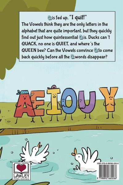 Q is fed up, "I quit!" The Vowels think they are the only letters in the alphabet that are quite important, but they quickly find out just how quintessential Q is. Ducks can't quack, no one is quiet, and where's the queen bee? Can the Vowels convince Q to come back quickly before all the Q words disappear?