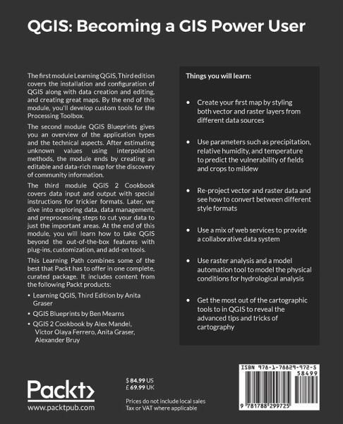 Master data management, visualization, and spatial analysis techniques in QGIS and become a GIS power user Key Features:Learn how to work with various types of data and create beautiful maps using this easy-to-follow guide Give a touch of professionalism to your maps, both for functionality and look and feel, with the help of this practical guide This progressive, hands-on guide builds on a geo-spatial data and adds more reactive maps using geometry tools. Book Description: The first module Learning QGIS, Third edition covers the installation and configuration of QGIS. You'll become a master in data creation and editing, and creating great maps. By the end of this module, you'll be able to extend QGIS with Python, getting in-depth with developing custom tools for the Processing Toolbox. The second module QGIS Blueprints gives you an overview of the application types and the technical aspects along with few examples from the digital humanities. After estimating unknown values using interpolation methods and demonstrating visualization and analytical techniques, the module ends by creating an editable and data-rich map for the discovery of community information. The third module QGIS 2 Cookbook covers data input and output with special instructions for trickier formats. Later, we dive into exploring data, data management, and preprocessing steps to cut your data to just the important areas. At the end of this module, you will dive into the methods for analyzing routes and networks, and learn how to take QGIS beyond the out-of-the-box features with plug-ins, customization, and add-on tools. This Learning Path combines some of the best that Packt has to offer in one complete, curated package. It includes content from the following Packt products: ¿ Learning QGIS, Third Edition by Anita Graser ¿ QGIS Blueprints by Ben Mearns ¿ QGIS 2 Cookbook by Alex Mandel, Víctor Olaya Ferrero, Anita Graser, Alexander Bruy What You Will Learn:Create your first map by styling both vector and raster layers from different data sources Use parameters such as precipitation, relative humidity, and temperature to predict the vulnerability of fields and crops to mildew Re-project vector and raster data and see how to convert between different style formats Use a mix of web services to provide a collaborative data system Use raster analysis and a model automation tool to model the physical conditions for hydrological analysis Get the most out of the cartographic tools to in QGIS to reveal the advanced tips and tricks of cartography Who this book is for: If you are a user, developer, or consultant and want to know how to use QGIS to achieve the results you are used to from other types of GIS, then this learning path is for you. You are expected to be comfortable with core GIS concepts. This Learning Path will make you an expert with QGIS by showing you how to develop more complex, layered map applications. It will launch you to the next level of GIS users.