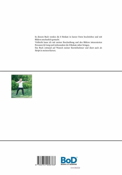 In diesem Buch werden die 8 Brokate in kurzer Form beschrieben und mit Bildern anschaulich gemacht. Vielleicht kann ich mit meiner Beschreibung und den Bildern interessierten Personen Qi Gong und insbesondere die 8 Brokate näher bringen. Das Buch entstand auf Wunsch meiner Kursteilnehmer und dient auch als Skript in meinen Kursen.