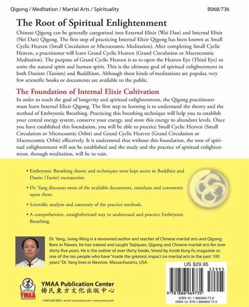 The Root of Spiritual Enlightenment Chinese Qigong can be generally categorized into External Elixir (Wai Dan) and Internal Elixir (Nei Dan) Qigong. The first step of practicing Internal Elixir Qigong has been known as Small Cyclic Heaven (Small Circulation or Microcosmic Meditation). After completing Small Cyclic Heaven, a practitioner will learn Grand Cyclic Heaven (Grand Circulation or Macrocosmic Meditation). The purpose of Grand Cyclic Heaven is to re-open the Heaven Eye (Third Eye) to unite the natural spirit and human spirit. This is the ultimate goal of spiritual enlightenment in both Daoism (Taoism) and Buddhism. Although these kinds of meditations are popular, very few scientific books or documents are available to the public. The Foundation of Internal Elixir Cultivation In order to reach the goal of longevity and spiritual enlightenment, the Qigong practitioner must learn Internal Elixir Qigong. The first step to learning is to understand the theory and the method of Embryonic Breathing. Practicing this breathing technique will help you to establish your central energy system, conserve your energy, and store this energy to abundant levels. Once you have established this foundation, you will be able to practice Small Cyclic Heaven (Small Circulation or Microcosmic Orbit) and Grand Cyclic Heaven (Grand Circulation of Macrocosmic Orbit) effectively. It is understood that without this foundation, the root of spiritual enlightenment will not be established and the study and the practice of spiritual enlightenment, through meditation, will be in vain. * Embryonic Breathing theory and techniques were kept secret in Buddhist and Daoist (Taoist) monasteries. * Dr. Yang discusses most of the available documents, translates and comments upon them. * Scientific analysis and summary of the practice methods. * A comprehensive, straightforward way to understand and practice Embryonic Breathing.