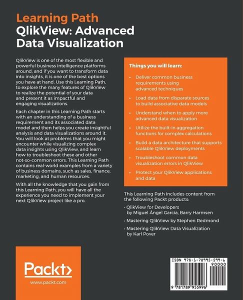 Build powerful data analytics applications with this business intelligence tool and overcome all your business challenges Key Features: - Master time-saving techniques and make your QlikView development more efficient - Perform geographical analysis and sentiment analysis in your QlikView applications - Explore advanced QlikView techniques, tips, and tricks to deliver complex business requirements Book Description: QlikView is one of the most flexible and powerful business intelligence platforms around, and if you want to transform data into insights, it is one of the best options you have at hand. Use this Learning Path, to explore the many features of QlikView to realize the potential of your data and present it as impactful and engaging visualizations. Each chapter in this Learning Path starts with an understanding of a business requirement and its associated data model and then helps you create insightful analysis and data visualizations around it. You will look at problems that you might encounter while visualizing complex data insights using QlikView, and learn how to troubleshoot these and other not-so-common errors. This Learning Path contains real-world examples from a variety of business domains, such as sales, finance, marketing, and human resources. With all the knowledge that you gain from this Learning Path, you will have all the experience you need to implement your next QlikView project like a pro. This Learning Path includes content from the following Packt products: - QlikView for Developers by Miguel Ángel García, Barry Harmsen - Mastering QlikView by Stephen Redmond - Mastering QlikView Data Visualization by Karl Pover What You Will Learn: - Deliver common business requirements using advanced techniques - Load data from disparate sources to build associative data models - Understand when to apply more advanced data visualization - Utilize the built-in aggregation functions for complex calculations - Build a data architecture that supports scalable QlikView deployments - Troubleshoot common data visualization errors in QlikView - Protect your QlikView applications and data Who this book is for: This Learning Path is designed for developers who want to go beyond their technical knowledge of QlikView and understand how to create analysis and data visualizations that solve real business needs. To grasp the concepts explained in this Learning Path, you should have a basic understanding of the common QlikView functions and some hands-on experience with the tool.