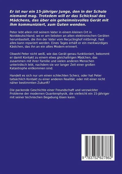 Er ist nur ein 15-jähriger Junge, den in der Schule niemand mag. Trotzdem will er das Schicksal des Mädchens, das über ein geheimnisvolles Gerät mit ihm kommuniziert, zum Guten wenden.Peter lebt allein mit seinem Vater in einem kleinen Ort in Norddeutschland, wo er am liebsten an alten elektronischen Geräten herumbastelt, die ihm der Vater vom Recyclinghof mitbringt. Fast alles kann repariert werden. Eines Tages erhält er ein merkwürdiges Kästchen, das ihn an ein altes Modem erinnert.Obwohl Peter nicht weiß, wie das Gerät genau funktioniert, bekommt er damit Kontakt zu einem etwa gleichaltrigen Mädchen, das zusammen mit ihrer Familie und vielen anderen Menschen unterirdisch lebt, nachdem sie vor langer Zeit einer großen Katastrophe entkommen sind.Handelt es sich nur um einen schlechten Scherz, oder hat Peter tatsächlich Kontakt zu einer anderen Realität, oder mit einer nicht näher bestimmten Zukunft?Die packende Geschichte einer Freundschaft und verzwickter Probleme der modernen Quantenphysik, die vielleicht ein 15-jähriger mit seiner technischen Begabung lösen kann.