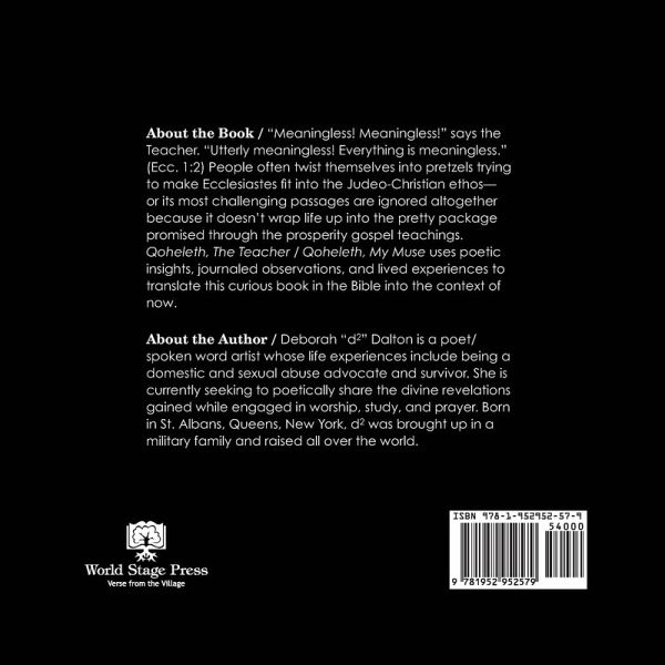 "Meaningless! Meaningless!" says the Teacher. "Utterly meaningless! Everything is meaningless." (Ecc. 1:2) People often twist themselves into pretzels trying to make Ecclesiastes fit into the Judeo-Christian ethos-or its most challenging passages are ignored altogether because it doesn't wrap life up into the pretty package promised through the prosperity gospel teachings. Qoheleth, The Teacher / Qoheleth, My Muse uses poetic insights, journaled observations, and lived experiences to translate this curious book in the Bible into the context of now.