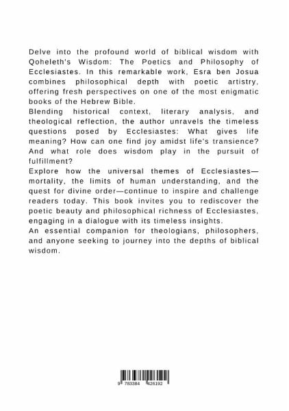 Delve into the profound world of biblical wisdom with Qoheleth's Wisdom: The Poetics and Philosophy of Ecclesiastes. In this remarkable work, Esra ben Josua combines philosophical depth with poetic artistry, offering fresh perspectives on one of the most enigmatic books of the Hebrew Bible.Blending historical context, literary analysis, and theological reflection, the author unravels the timeless questions posed by Ecclesiastes: What gives life meaning? How can one find joy amidst life's transience? And what role does wisdom play in the pursuit of fulfillment?Explore how the universal themes of Ecclesiastes-mortality, the limits of human understanding, and the quest for divine order-continue to inspire and challenge readers today. This book invites you to rediscover the poetic beauty and philosophical richness of Ecclesiastes, engaging in a dialogue with its timeless insights.An essential companion for theologians, philosophers, and anyone seeking to journey into the depths of biblical wisdom.