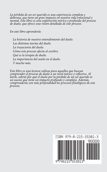 La pérdida de un ser querido es una experiencia compleja y dolorosa, que tiene un gran impacto en nuestra vida emocional y mental. Este libro es una exploración teórica y profunda del proceso de duelo, que ofrece una visión detallada de este proceso. En este libro aprenderás:La historia de nuestro entendimiento del duelo. Las distintas teorías del duelo. La trayectoria del duelo. Cómo este proceso afecta al cerebro. Qué es la terapia de duelo. La importancia del sueño en el duelo. Y mucho más. Este libro es una lectura valiosa para aquellos que buscan comprender el proceso de duelo a un nivel teórico y reflexivo. Al leerlo, sabrás por qué el duelo por la pérdida de un ser querido es un suceso que tiene un impacto profundo y complejo. Además, comprenderás con más profundidad los procesos fisiológicos de este proceso.
