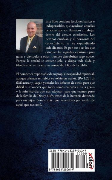 Este libro contiene lecciones básicas e indispensables, que ayudaran aquellas personas que son llamados a trabajar dentro del circulo eclesiástico. Los tiempos cambian y el horizonte del conocimiento se va expandiendo cada día más. Es por eso que, los que estudian las sagradas escrituras para guiar y discipular a otros, siempre descubrirán algo nuevo. Porque la verdad se sostiene sola, y disipa toda duda y filosofía que se levante en contra del Dios de la biblia.El hombre es responsable de su propia incapacidad espiritual, aunque afirman ser sabios se volvieron necios. [Ro.1:22] Es fácil acusar y juzgar, y señalar los defectos de otros, pero que difícil es reconocer que todos somos culpables. Es la gracia y la misericordia que nos adoptan, para que seamos parte de la familia de Dios y disfrutemos de la herencia destinada para sus hijos. Somos más que vencedores por medio de aquel que nos amó.