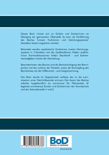 Dieses Buch richtet sich an Schüler und Schülerinnen im Übergang zur gymnasialen Oberstufe. Es kann als Fortführung des Buches 'Lineare Funktionen und Gleichungssysteme' desselben Autors angesehen werden.Behandelt werden quadratische Funktionen, lineare Gleichungssysteme in 3 Variablen und das Gaußverfahren. Neben ausführlichen Kurvendiskussionen bilden Steckbrief- und Extremwertaufgaben Inhalte der Darstellung.Besonderheiten des Buches sind die Berücksichtigung des Brennpunkts und der Leitlinie der Parabeln sowie die Verknüpfung des Buchthemas mit der Differential- und Integralrechnung.Das Buch wurde im Gesprächsstil verfasst, der an die Lernsituation einer Nachhilfestunde erinnert. Der Autor des Buches arbeitet hauptberuflich als Lerntrainer für Mathematik. Er begleitet und betreut Schüler und Schülerinnen der Grundschule und der Sekundarstufen I und II.