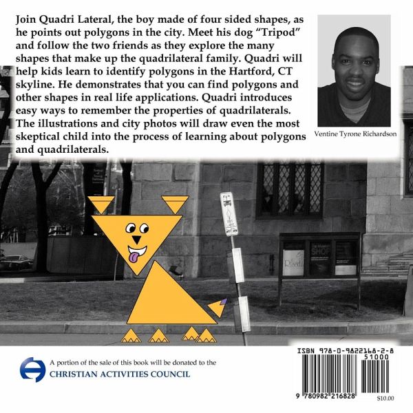 Join Quadri Lateral, the boy made of four sided shapes, as he points out polygons in the city. Meet his dog "Tripod" and follow the two friends as they explore the many shapes that make up the quadrilateral family. Quadri will help kids learn to identify polygons in the Hartford, CT skyline. He demonstrates that you can find polygons and other shapes in real life applications. Quadri introduces easy ways to remember the properties of quadrilaterals. The illustrations and city photos will draw even the most skeptical child into the process of learning about polygons and quadrilaterals.