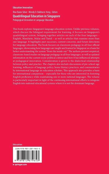 Introduction.- Chapter 1 Overarching themes, bilingual dreams and multilingual landscapes: Quadrilingual education in Singapore.- Section 1: Transitions.- Chapter 2 Transmission and development of literacy values and practices: An ethnographic study of a Malay family in Singapore.- Chapter 3 "I believe, therefore I practice": Teachers' beliefs on literacy acquisition and their classroom practices.- Chapter 4 Commentary on 'Transitions'.- Section 2: Competencies.- Chapter 5 A reading profile of Singapore primary school students and implications for reading pedagogy.- Chapter 6 Morphological awareness and reading development in bilingual English-Chinese children in Singapore.- Chapter 7 Taking stock of the effects of strategies-based instruction on writing in Chinese and English in Singapore primary classrooms.- Chapter 8 Commentary on 'Competencies'.- Section 3: Practices.- Chapter 9 Student engagement in reading.- Chapter 10 Distinctiveness and uniformity: Teaching language in Singapore primary grades 1 & 2.- Chapter 11 Cultural representation in Teachers' talk: A functional analysis of Singapore's Chinese classroom discourse.- Chapter 12 Morphological teaching and Singaporean children's English word learning.- Chapter 13 Commentary on 'Practices'.- Section 4: Reforms.- Chapter 14 Use and impact of spoken Tamil in the early Tamil classrooms.- Chapter 15 Inculcation of Malay values and culture in language pedagogy in Singapore.- Chapter 16 Coding and comparing pedagogic features of teaching practices: What happens in Chinese language classes in Singapore's primary school?.- Chapter 17 Teaching Chinese to English-speaking Bilinguals.- Chapter 18 Commentary on 'Reforms'.- Conclusion.- Chapter 19 Final words: A reflective synthesis.