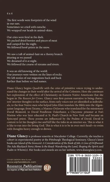 4 x 4 The first words were footprints of the wind in our ears. Sometimes we cried with earache. We wrapped our heads in animal-skins. Our cries were feral in the dark. We packed dried berries and pieces of meat and camped for the night. We followed hoof-prints in the snow. We saw a tuft of animal-hair on a thorny branch jittering as we passed We dreamed of it at night. We followed the course of streams and rivers. It was an old knowing of the world. Our journeys were written on the lines of rocks. We left stories of our migrations back and back further than before we had names. Diane Glancy begins Quadrille with the cries of primitive voices trying to understand the changes in their world after the arrival of the Colonists. Here she continues her exploration of the effect of Christianity on Eastern Native Americans that she began in The Reason for Crows. Glancy uses first-person narrative to bring characters' interior thoughts to the surface, from early voices not yet identified as individuals, to the four Native men who helped John Eliot translate the Bible into the Algonquian language; from Tatamy, a Munsee-Delaware who translated for the missionary David Brainerd, to David Pendleton Oakerhater, a Cheyenne prisoner at Fort Marion who was later educated at St. Paul's Church in New York and became an Episcopal priest. These poems are influenced by the Psalms of David. David is content to let his thoughts rise and fall like the tides in an interior sea. This is what it is like to run into the living God. This is what it is to be in over one's head--to swim with thoughts heavy enough to drown.
