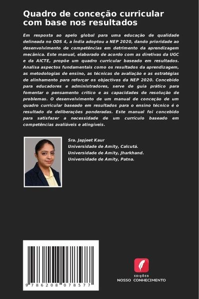Em resposta ao apelo global para uma educação de qualidade delineada no ODS 4, a Índia adoptou a NEP 2020, dando prioridade ao desenvolvimento de competências em detrimento da aprendizagem mecânica. Este manual, elaborado de acordo com as diretivas da UGC e da AICTE, propõe um quadro curricular baseado em resultados. Analisa aspectos fundamentais como os resultados da aprendizagem, as metodologias de ensino, as técnicas de avaliação e as estratégias de alinhamento para reforçar os objectivos da NEP 2020. Concebido para educadores e administradores, serve de guia prático para fomentar o pensamento crítico e as capacidades de resolução de problemas. O desenvolvimento de um manual de conceção de um quadro curricular baseado em resultados para o ensino técnico é o resultado de deliberações ponderadas. Este manual foi concebido para satisfazer a necessidade de um currículo baseado em competências avaliáveis e atingíveis.