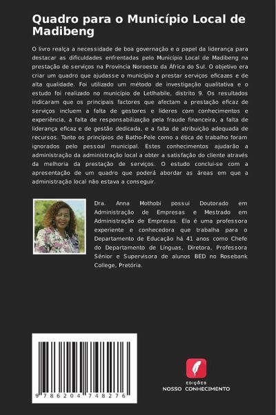 O livro realça a necessidade de boa governação e o papel da liderança para destacar as dificuldades enfrentadas pelo Município Local de Madibeng na prestação de serviços na Província Noroeste da África do Sul. O objetivo era criar um quadro que ajudasse o município a prestar serviços eficazes e de alta qualidade. Foi utilizado um método de investigação qualitativa e o estudo foi realizado no município de Letlhabile, distrito 9. Os resultados indicaram que os principais factores que afectam a prestação eficaz de serviços incluem a falta de gestores e líderes com conhecimentos e experiência, a falta de responsabilização pela fraude financeira, a falta de liderança eficaz e de gestão dedicada, e a falta de atribuição adequada de recursos. Tanto os princípios de Batho-Pele como a ética de trabalho foram ignorados pelo pessoal municipal. Estes conhecimentos ajudarão a administração da administração local a obter a satisfação do cliente através da melhoria da prestação de serviços. O estudo conclui-se com a apresentação de um quadro que poderá abordar as áreas em que a administração local não estava a conseguir.