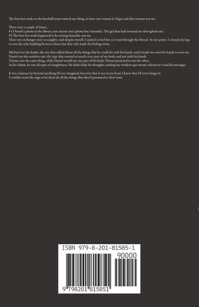 The four hot studs on the baseball team wanted one thing, to have one woman in Vegas and that woman was me. There were a couple of issues... #1 I found a phone in the library, not anyone else's phone but Amanda's. The girl that had tortured me throughout uni. #2 The four hot studs happened to be texting Amanda, not me. Their text exchanges were so naughty, and despite myself, I started to feel hot as I read through the thread. At one point, I crossed my legs to ease the ache building between them, but that only made the feeling worse. Michael was the leader, the one that talked about all the things that he could do with his hands, and it made me want his hands to own me. Daniel was the sensitive one, the type that wanted to touch every part of my body and not with his hands. Tristan, text the same thing, while Daniel would use one part of his body, Tristan promised to use the other. As for Adam, he was all types of naughtiness. He didn't hide his thoughts, making my windows get steamy whenever I read his messages. It was a fantasy far beyond anything I'd ever imagined, but now that it was in my head, I knew that I'd never forget it. I couldn't resist the urge to let them do all the things that they'd promised in their texts.