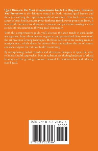 Quail Diseases: The Most Comprehensive Guide On Diagnosis, Treatment And Prevention is the definitive manual for both seasoned quail farmers and those just entering the captivating world of aviculture. This book covers every aspect of quail health, ensuring your feathered friends stay in prime condition. It unravels the intricacies of diagnosis, treatment, and prevention, making it a vital resource for maintaining a thriving quail community. With this comprehensive guide, you'll discover the latest trends in quail health management, from advancements in genetics and personalized diets, to state-of-the-art precision farming techniques. The book delves into the exciting realm of nutrigenomics, which allows for tailored diets, and explores the use of sensors and data analytics for real-time health monitoring. By incorporating herbal remedies and alternative therapies, it opens the door to holistic health approaches. Plus, it addresses the shifting landscape of ethical farming and the growing consumer demand for antibiotic-free and ethically raised quail.