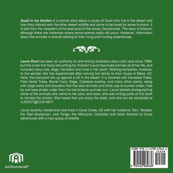 Quail in my Garden is a picture story about a covey of Quail who live in the desert and how they interact with the other desert wildlife and come to be loved by some humans. It is told from the viewpoint of the lead quail of the covey, Doublecrest. The story is fictional, although there are instances where some scenes really did occur. However, information about the animals is factual relating to their living and hunting experiences.