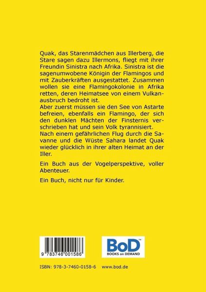 Quak, das Starenmädchen aus Illerberg, die Stare sagen dazu Illermons, fliegt mit ihrer Freundin Sinistra nach Afrika. Sinistra ist die sagenumwobene Königin der Flamingos und mit Zauberkräften ausgestattet. Zusammen wollen sie eine Flamingokolonie in Afrika retten, deren Heimatsee von einem Vulkanausbruch bedroht ist.Aber zuerst müssen sie den See von Astarte befreien, ebenfalls ein Flamingo, der sich den dunklen Mächten der Finsternis verschrieben hat und sein Volk tyrannisiert.Nach einem gefährlichen Flug durch die Savanne und die Wüste Sahara landet Quak wieder glücklich in ihrer alten Heimat an der Iller.Ein Buch aus der Vogelperspektive, voller Abenteuer.Ein Buch, nicht nur für Kinder.