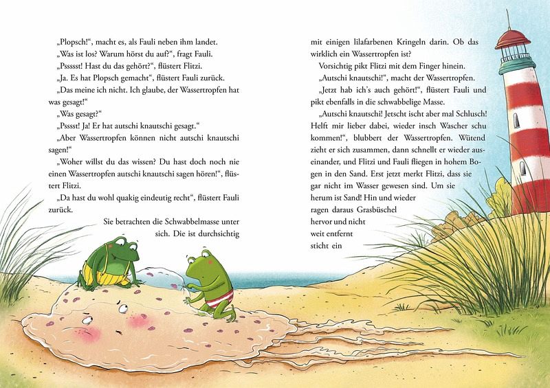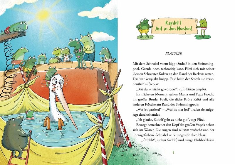 Ein Insel-Meer-und-Wellen-Abenteuer für Jungs und Mädchen Im Sommer kann es auf dem höchsten Dach einer großen Stadt schon mal ziemlich heiß werden. Zu heiß für den Storch Sudolf, der dort zusammen mit seinen Froschfreunden lebt. Kurzerhand beschließt er, zur Abkühlung in den Norden zu fliegen. Das klingt nach Abenteuer, da wollen die Froschkinder Flitzi, Fauli und Küken natürlich unbedingt dabei sein! Doch dann plumpsen Flitzi und Fauli während des Fluges vom Storchrücken und landen auf einer kleinen Insel mitten in der Nordsee. Wie sollen sie jetzt wieder nach Hause kommen?