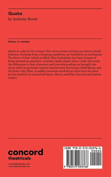Quake is a play for five women. Five wives of men working on a dam in South America, returning from a shopping expedition are isolated by an earthquake. The driver of their vehicle is killed. They find shelter, but their chances of being rescued are uncertain. A further quake shocks them. Under this strain the differences in their characters and interrelationships are brought into sharp belief. In particular tension rises between the strong-willed Marcia and the boss's wife, Ellen. A sudden imminent flood drives them from the place. As they head for an unresolved future, Marcia and Ellen have learned mutual respect.