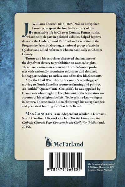 J. Williams Thorne (1816-1897) was an outspoken farmer who spent the first half-century of his remarkable life in Chester County, Pennsylvania, where he took part in political debates, helped fugitive slaves in the Underground Railroad and was active in the Progressive Friends Meeting, a national group of activist Quakers and allied reformers who met annually in Chester County. Williams and his associates discussed vital matters of the day, from slavery to prohibition to women's rights. These issues sometimes came to Thorne's doorstep--he met with nationally prominent reformers, and thwarted kidnappers seeking to enslave one of his free black tenants. After the Civil War, Williams became a ""carpetbagger,"" moving to North Carolina to pursue farming and politics. An ""infidel"" Quaker (anti-Christian), he was opposed by Democrats who sought to keep him out of the legislature on account of his religious beliefs. Today a little-known figure in history, Williams made his mark through his outspokenness and persistent battling for what he believed.