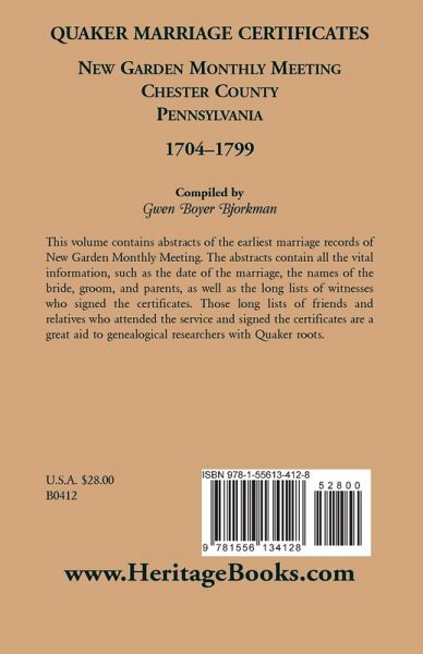 This volume contains abstracts of the earliest marriage records of New Garden Monthly Meeting. The abstracts contain all the vital information, such as the date of the marriage, the names of the bride, groom, and parents, as well as the long lists of witnesses who signed the certificates. Those long lists of friends and relatives who attended the service and signed the certificates are a great aid to genealogical researchers with Quaker roots.