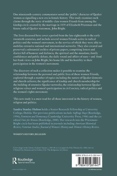 Sandra Holton is Senior Research Fellow in the Department of History, University of Adelaide, South Australia. Her previous publications include Suffrage Days (Routledge, 1996), Feminism and Democracy (Cambridge University Press, 1986) and she co-edited Votes for Women (Routledge, 2000). Her research into on the Priestman - Bright circle has been published in journals including American Historical Review, Victorian Studies, Journal of Women's History and Women's History review.