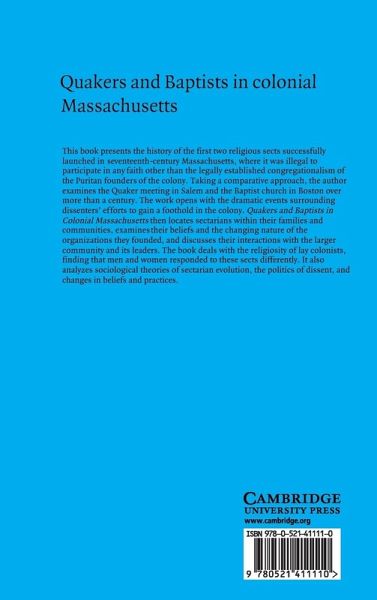 This book presents the history of two religious sects successfully established in seventeenth-century Massachusetts, where it was illegal to participate in any faith other than the legally established congregationalism of the Puritan founders of the colony. The author examines the Quaker meeting in Salem and the Baptist church in Boston over more than a century. The work opens with the dramatic events surrounding dissenters' efforts to gain a foothold in the colony, and goes on to locate sectarians within their families and communities, and to examine their beliefs and the changing nature of the organizations they founded and their interactions with the larger community and its leaders. The work deals with the religiosity of lay colonists, finding that men and women responded to these sects differently. It also analyzes sociological theories of sectarian evolution, the politics of dissent, and changes in beliefs and practices.
