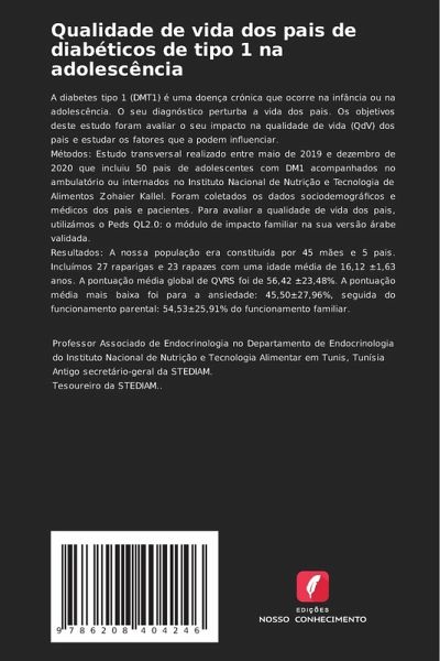 A diabetes tipo 1 (DMT1) é uma doença crónica que ocorre na infância ou na adolescência. O seu diagnóstico perturba a vida dos pais. Os objetivos deste estudo foram avaliar o seu impacto na qualidade de vida (QdV) dos pais e estudar os fatores que a podem influenciar. Métodos: Estudo transversal realizado entre maio de 2019 e dezembro de 2020 que incluiu 50 pais de adolescentes com DM1 acompanhados no ambulatório ou internados no Instituto Nacional de Nutrição e Tecnologia de Alimentos Zohaier Kallel. Foram coletados os dados sociodemográficos e médicos dos pais e pacientes. Para avaliar a qualidade de vida dos pais, utilizámos o Peds QL2.0: o módulo de impacto familiar na sua versão árabe validada. Resultados: A nossa população era constituída por 45 mães e 5 pais. Incluímos 27 raparigas e 23 rapazes com uma idade média de 16,12 ±1,63 anos. A pontuação média global de QVRS foi de 56,42 ±23,48%. A pontuação média mais baixa foi para a ansiedade: 45,50±27,96%, seguida do funcionamento parental: 54,53±25,91% do funcionamento familiar.