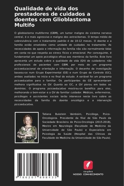 O glioblastoma multiforme (GBM), um tumor maligno do sistema nervoso central, é o mais agressivo e maligno dos astrocitomas. O tempo médio de sobrevivência com o tratamento padrão é de 10-12 meses. O doente e a família estão envolvidos como unidade de cuidados no tratamento. As necessidades de apoio e informação da família não são normalmente tidas em conta no que respeita ao stress físico e emocional. Por conseguinte, é fundamental um apoio psicológico eficaz aos membros da família. Este livro apresenta um estudo sobre a qualidade de vida (QV) de cuidadores não profissionais de pacientes com GBM, por meio de um programa psicoeducacional de orientação e informação. O desenho da investigação baseou-se num Grupo Experimental (GE) e num Grupo de Controlo (GC), ambos avaliados no início e no final do estudo. A variável foi um programa psicoeducativo para o familiar. Os participantes do GE apresentaram melhora significativa na QV. Quanto ao GC, a QV piorou em todos os domínios. O programa psicoeducativo mostrou-se benéfico para eles, melhorando o bem-estar e a QV do familiar cuidador. Médicos, enfermeiros, psicólogos e assistentes sociais terão interesse neste livro sobre as necessidades da família do doente oncológico e a intervenção psicoeducativa.